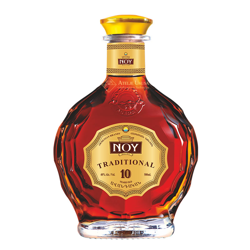 Jermenski konjak "NOY Traditional" 10 je napravljen od mešavine konjaka koji su odležali u hrastovim buradima najmanje deset godina. Tradicionalni konjak pokazuje čist, harmoničan ukus i prefinjenu aromu sa primesama začina. Upoznaje vas sa vekovima starom tradicijom proizvodnje jermenskog konjaka, osvajajući vas svojim elegantnim, snažnim karakterom.