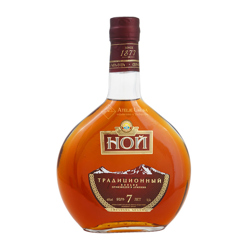 Jermenski konjak "NOY Traditional" 7 je napravljen od mešavine konjaka koji su odležali u hrastovim buradima najmanje sedam godina. Tradicionalni konjak pokazuje čist, harmoničan ukus i prefinjenu aromu sa primesama začina. Upoznaje vas sa vekovima starom tradicijom proizvodnje jermenskog konjaka, osvajajući vas svojim elegantnim, snažnim karakterom.